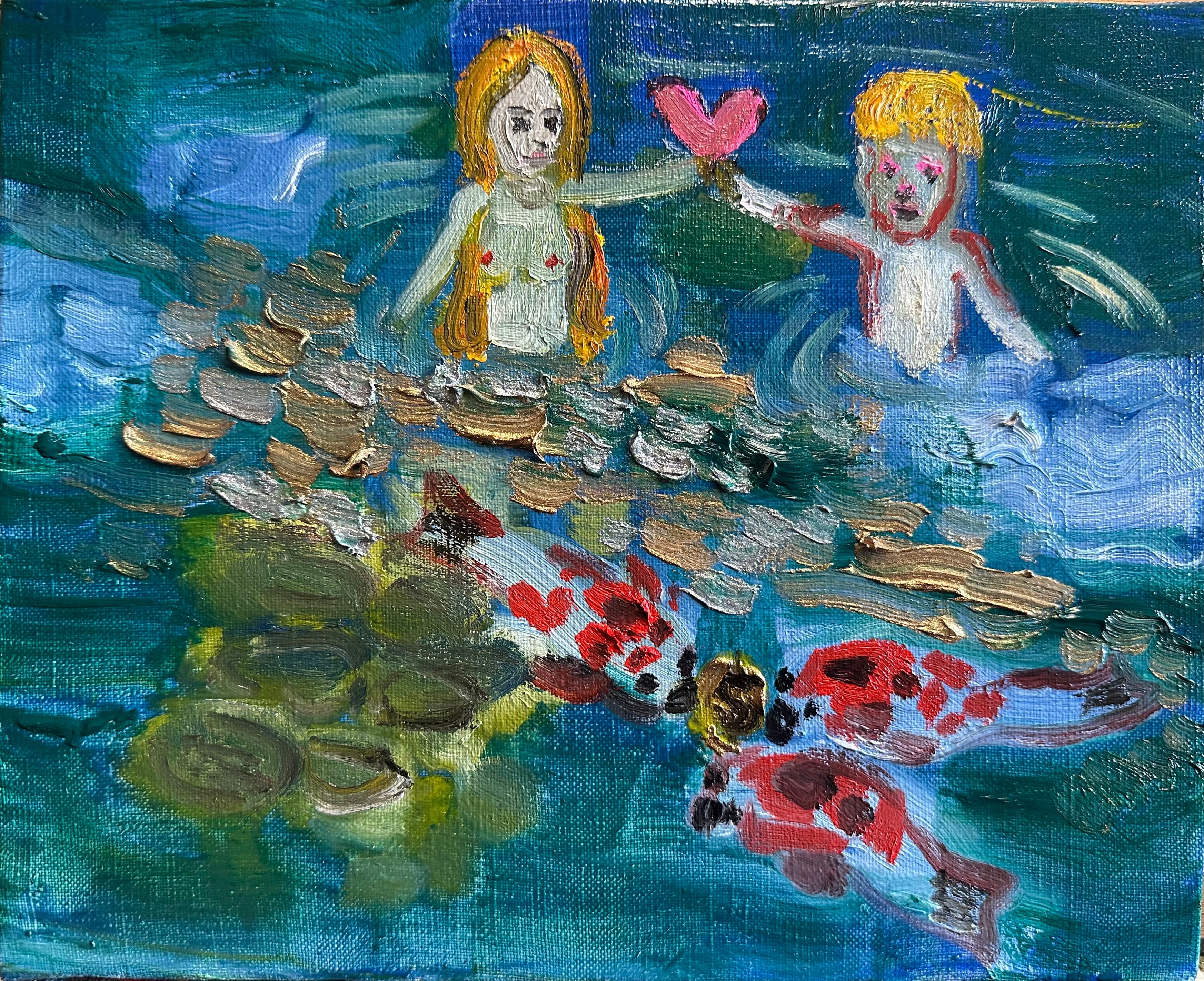 静かな池の中で、二人は小さなハートを見つけました。